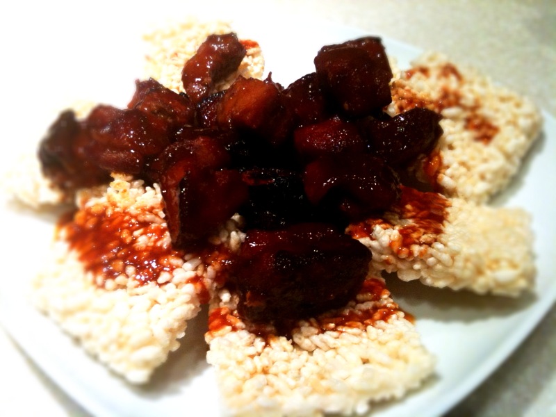 Clean the baby back ribs, I slices the meat up but didn’t cut through, since didn’t have a lot of time for the marination. Pour Korean bbq marinate all over the ribs, cover all the way, overnight if possible, if not, at least 2 hours. Preheat oven at 375 degrees, cover baking dish with heavy duty foil, put the marinated ribs into dish, save marinate for basting. Bake for 1 hour, baste every 10 minutes. When meat is done, sprinkle the brown sugar on top of ribs, turn oven to broil, broil for 3-4 minutes until sugar turns dark brown. Put crunchy rice pattie on serving plate, pile ribs on top, then drizzle left over sauce on top. Done!