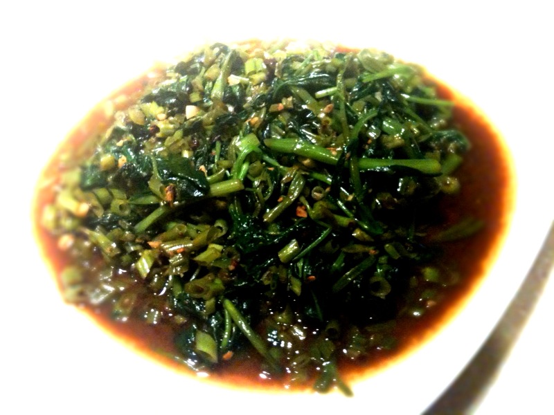 Clean the hollow heart vegi thoroughly. Heat up the oil in a wok, stir in garlic until fregrant, then add the black bean sauce, stir around, then add the small pieces of stem, stir for 2 minutes. Add the leafy part, cover wok for 1 minute to let the leaf welt, stir a bit then add in fish sauce, when all leaves are welt, it’s ready to be served!