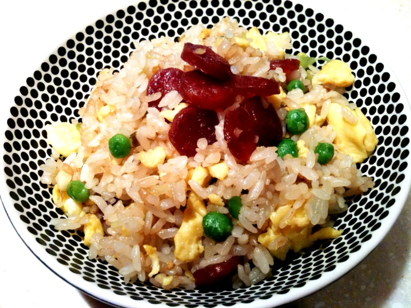 Toss in the rice and green onions, stir until evenly heated, add in the eggs, Chinese sausages and green peas, add Maggi sauce and sugar, adjust the amount to your preference, stir fry until everything’s blended evenly, I like to leave them in the wok a bit longer to harden the bottom portion of the rice, it adds a little crunchiness to the rice. Ready to be enjoyed!