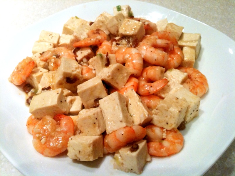 Heat up some oil, toss in tofu cubes, add in water, rice wine and 1T chicken seasoning, stir fry until heat through, add the shrimp back and mix everything well. Add in the corn starch and water mixture to thicken up the sauce, then the pepper to give it a bit more kick, when everything’s cooked through and mixed well, serve with white rice!