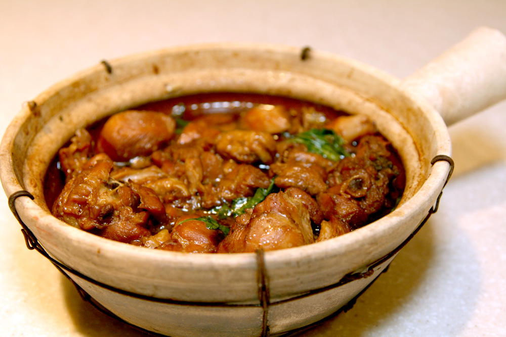 Heat up a claypot on high heat and add the dark sesame oil. Add garlic and ginger and stir-fry until aromatic. Add in chicken and do a few quick stirs. Add soy sauce, sweet soy sauce, Shaoxing wine and continue to stir-fry the chicken. Cover the chicken and lower the heat and simmer for at least 30 minutes. Add basil leaves and stir well with the chicken, dish out and serve immediately.