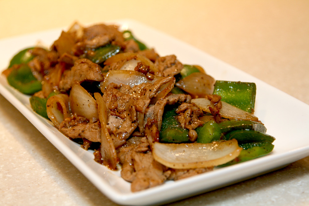 Heat up a wok and add cooking oil. When the cooking oil is hot, add the sliced onions and quickly stir-fry until aromatic and follow by the bell pepper and black pepper. Stir-fry for 1 minute and add in the pork slices . Continue to stir-fry until the pork is no longer pink. Add in soy sauce, Maggi sauce, sugar, and continue to stir-fry until the onions are caramelized. Dish out and serve hot.