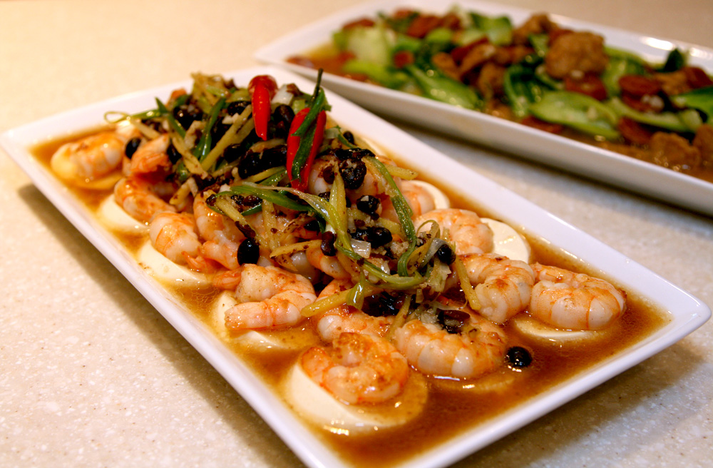 Meanwhile, in a medium skillet, heat 1 tablespoon of the oil. Add the shrimp, season with salt and pepper and cook over high heat until pink and curled, about 1 minute per side. Transfer to a bowl. Add the remaining 1 tablespoons of oil to the skillet and heat until shimmering. Add the ginger, green onion, red pepper and garlic and cook over moderate heat until fragrant, about 2 minutes. Add the black beans and stir-fry for 1 minute. Add the 1/4 cup of rice wine, stock and sugar and simmer until slightly reduced, 2 to 3 minutes. Transfer the tofu and shrimp to plates. Top with the sauce and serve.
