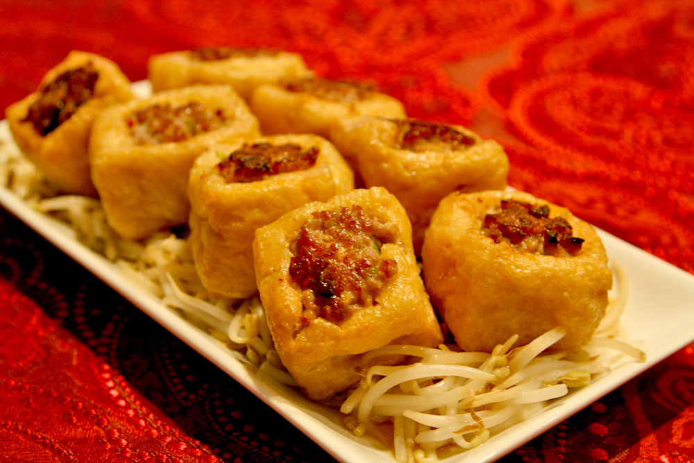 2. Poke a hole in the center of a piece of fried tofu, take out some of the center and stuff with pork mixture. Pack in tightly. Repeat until you finish stuffing all the fried tofu pieces.