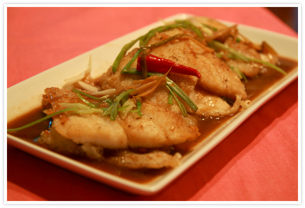 5. Reserve a tbsp of oil in the wok. Toss in the ginger, garlic, green onions and chilies, stir fry for 30 seconds. Add the sauces and cook over low heat for 2 minutes (to evaporate the alcohol) and pour over fish. Garnish with herbs and serve immediately with steam rice.