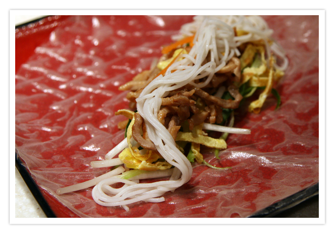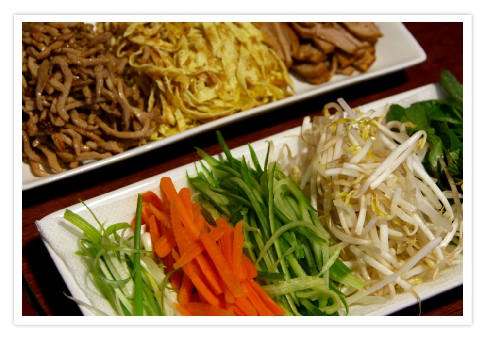 For tonight’s super simple and healthy meal, there really isn’t a recipe, just find whatever vegetables/herbs you have on hand, wash them and cut them into thin slivers (I used Green Onions, Carrots, Cucumbers, bean sprouts and Thai Basil). For the protein plate, I pan fried some Vietnamese ham (cut into thin slices), made thin egg crepe then sliced them thinly. Cut shabu pork into thin strings, marinate with some soy sauce, sesame oil and sprinkle with corn starch, pan fry for 3-4 minutes.