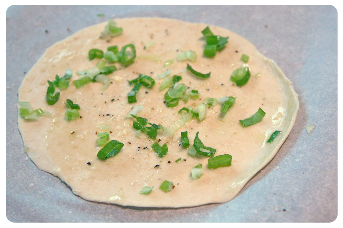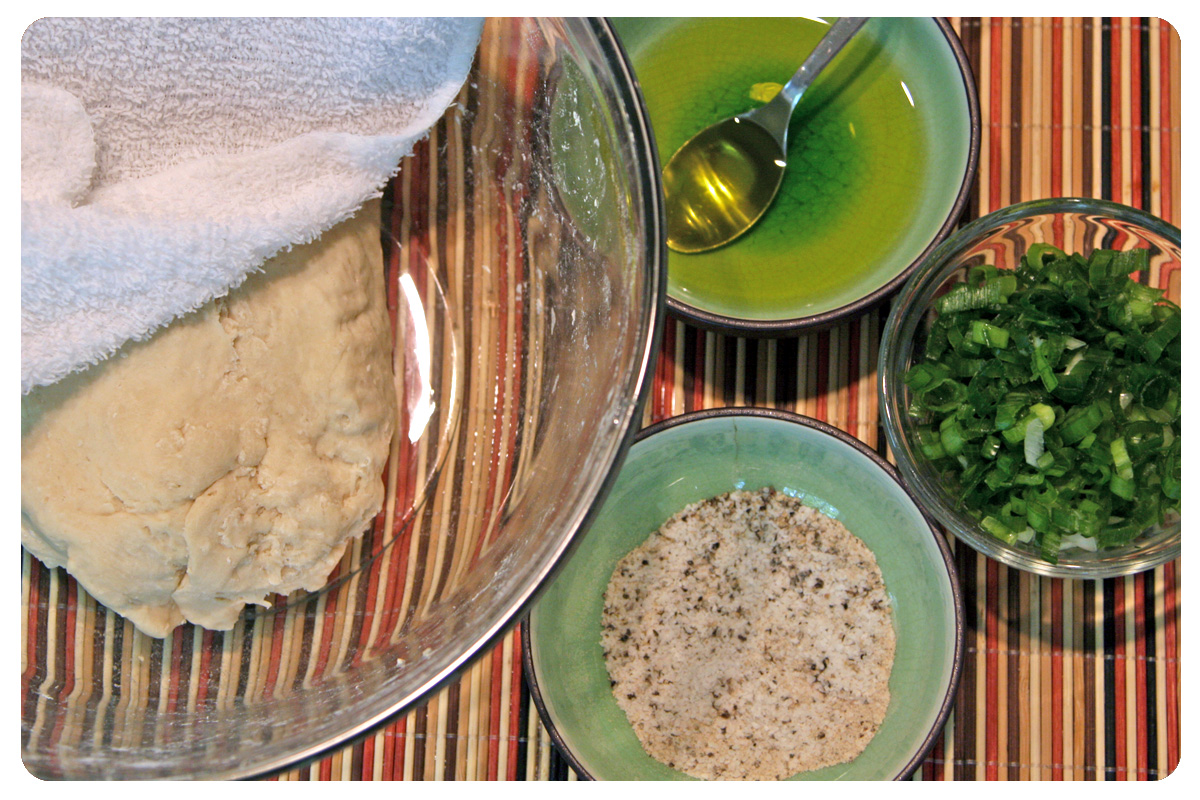 Place a ball of dough on a well-floured work surface and roll out into a thin circle (about 1/16th inch thickness). Spread a little of oil evenly over the pancake (use more if needed). Sprinkle salt and pepper mix evenly over the pancake. Sprinkle green onions over the pancake. Roll the pancake up from one end like a rug, then curl the roll around in a spiral and pinch the end to the roll so it stays wrapped. With the palm of your hand, press the roll from the top to flatten it. Roll the pancake out to 1/8th inch thickness. Heat a tablespoon of oil on a flat, wide pan over a medium-low to medium flame until hot. Set the pancake in the oil and let fry until the bottom is crisp and golden. Flip the pancake, adding more oil as needed. Remove from heat and serve immediately or reheat in the toaster.