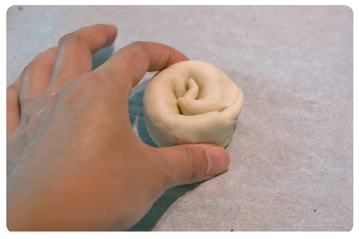 Knead the dough about until smooth then cover with a damp towel for 30 minutes. Take the dough and form a flattened dome. Cut into 10-12 pieces of equal size. Roll the pieces into balls.